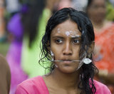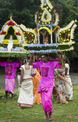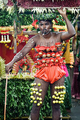 This Tamil festival is dedicated to Lord Muruga and symbolises the victory of good other evil. Believers prepare themselves during days of fast, prayers, and prepare “Cavadee”, an arch-shaped structure decorated with flowers, fruit, leaves and peacock feathers. In the morning of the celebration believers, dressed in fushia, the color of purity, make ablutions at a river, and get their tongue or cheeks pieced with a “vel”, a needle in the shape of a spear. Some decorate their body with fan-shape patterns of “vels”. Those who do not wear “vels” tie a scarf around their mouth as all are committed to silence. Then starts the procession to the temple: the devotees carry the “Cavadee” on their shoulders and some women hold brass pots of milk on their head. .